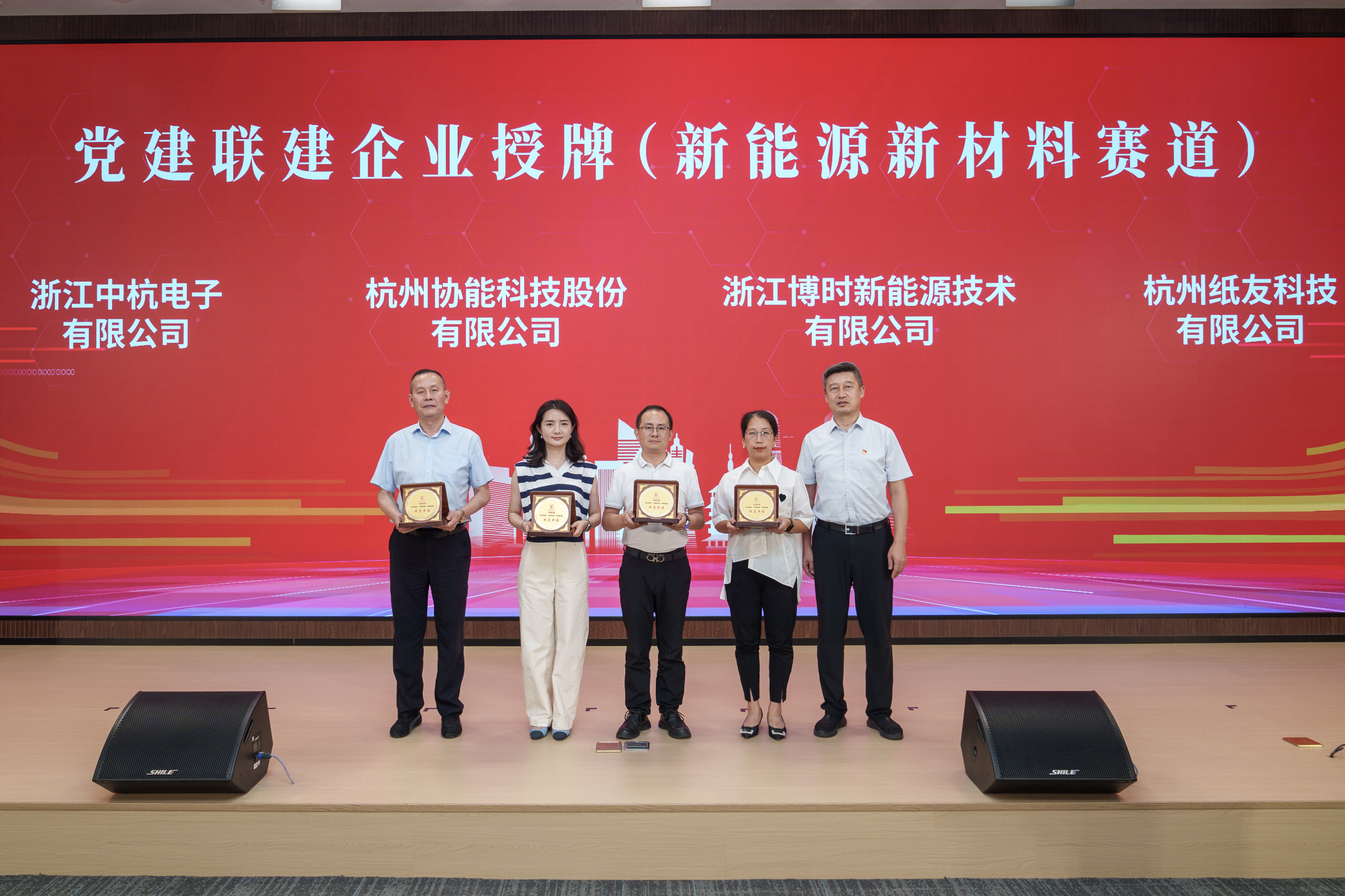 活动现场,杭州市国资委党委副书记宣寅,余杭区人大常委会副主任、余杭经济开发区党工委书记朱红耀,九洲官方网站党委副书记、副董事长、总经理郭东晓,市经信局中小企业发展处副处长沈洋分别为视觉智能、低空经济、高端装备制造、新能源新材料四个赛道的党建联建成员单位授牌。